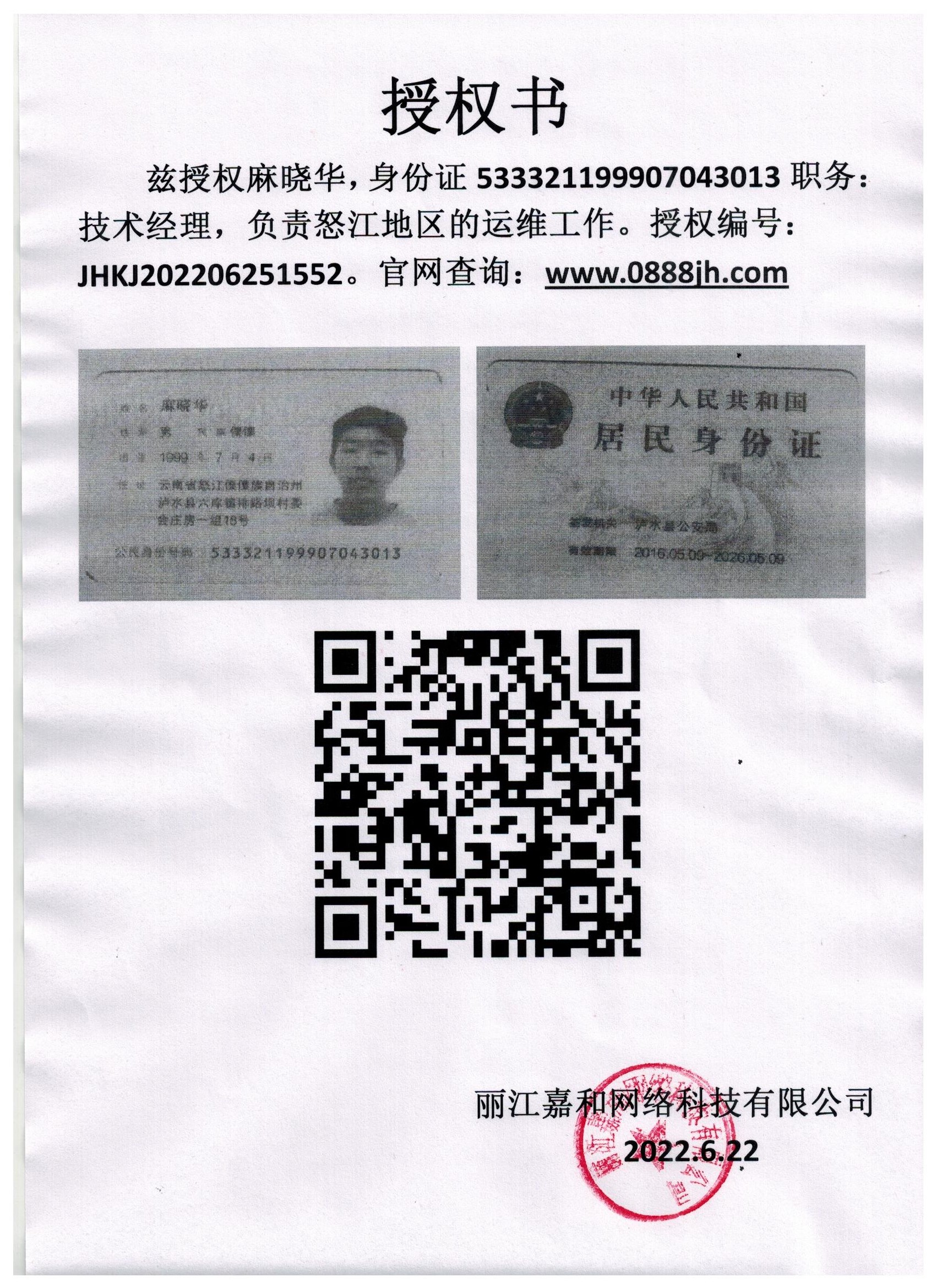 茲授權麻曉華負責怒江地區的運維工作(授權編號:JHKJ202206251552)