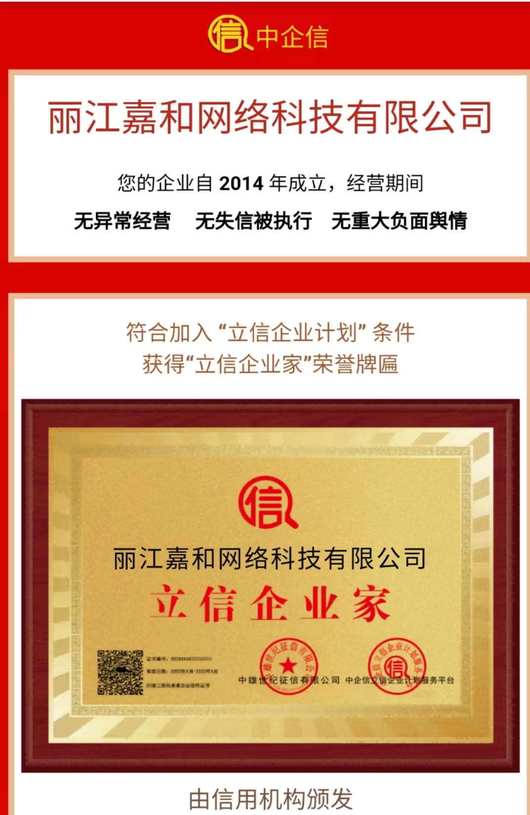 熱烈慶祝我司榮獲立信企業(yè)信用累積第2年守信典范
