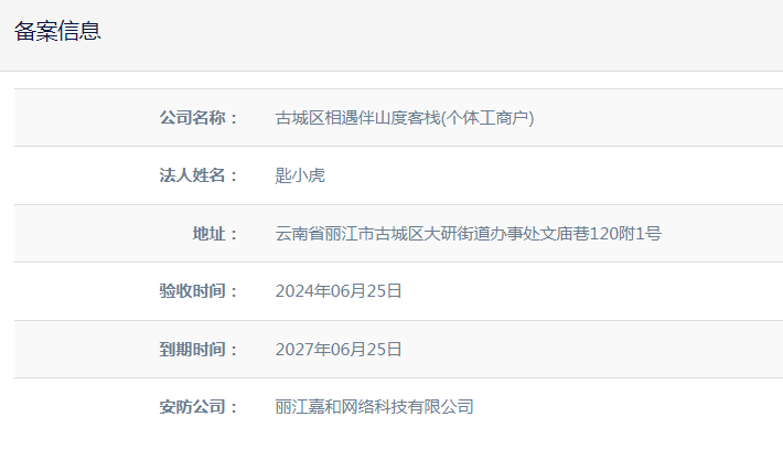 關于古城區相遇伴山度客棧(個體工商戶)電子監控安防證下證通知