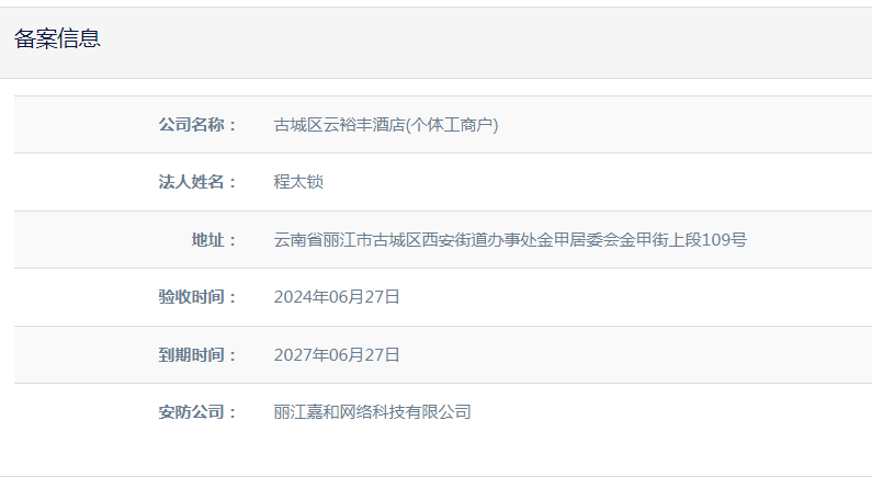 關于古城區云裕豐酒店(個體工商戶)電子監控安防合格證下證通知