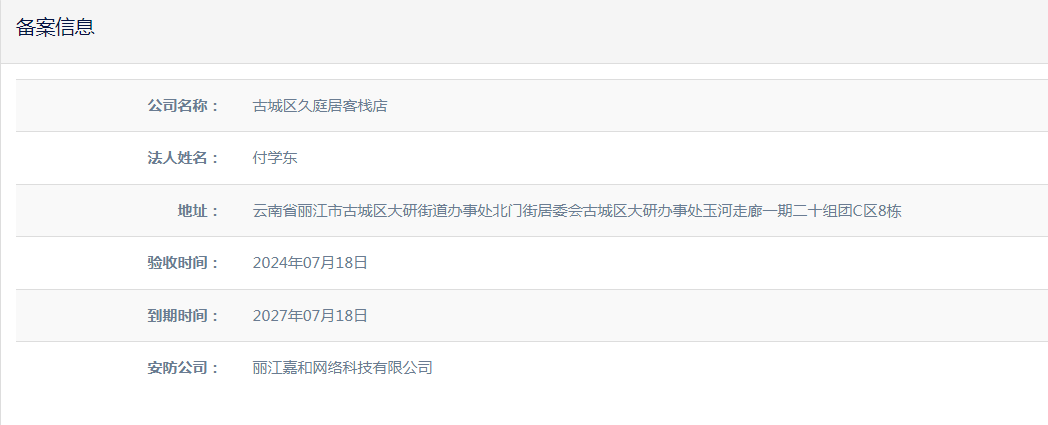 關于古城區久庭居客棧店電子監控安防合格證下證通知