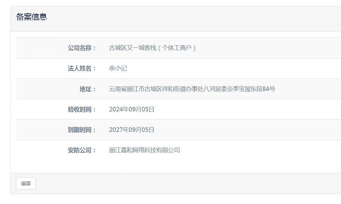 關于古城區春淋閣客棧店(個體工商戶)電子監控安防合格證下證通知