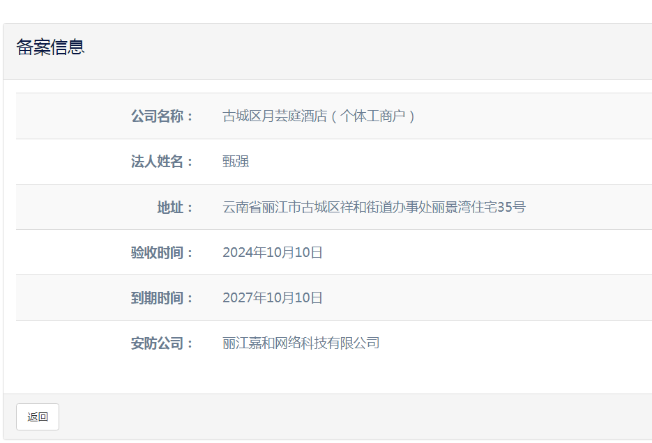 古城區(qū)月蕓庭酒店(個(gè)體工商戶)電子監(jiān)控安防合格證下證通知