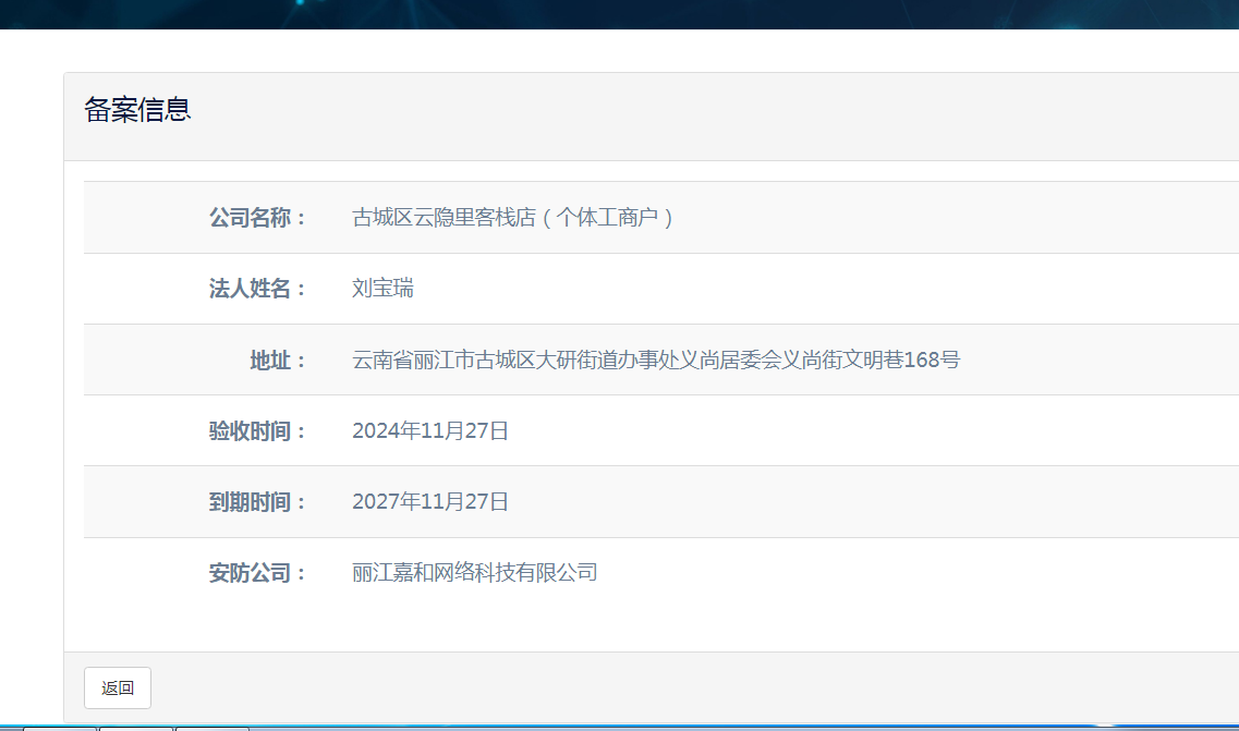 關于古城區(qū)云隱里客棧店(個體工商戶)電子監(jiān)控安防合格證下證通知