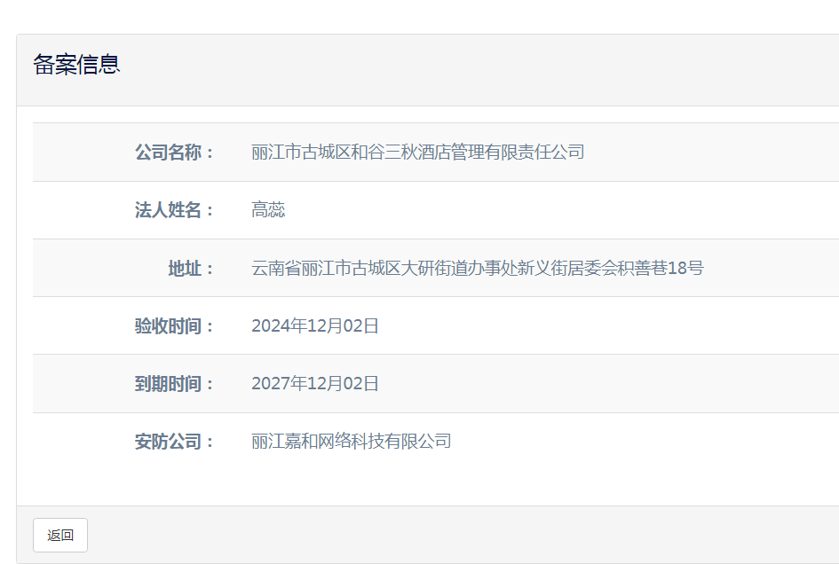 關于麗江市古城區和谷三秋酒店管理有限責任公司電子監控安防合格證下證通知