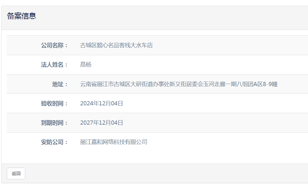 關于古城區懿心名品客棧大水車店電子監控安防合格證下證通知