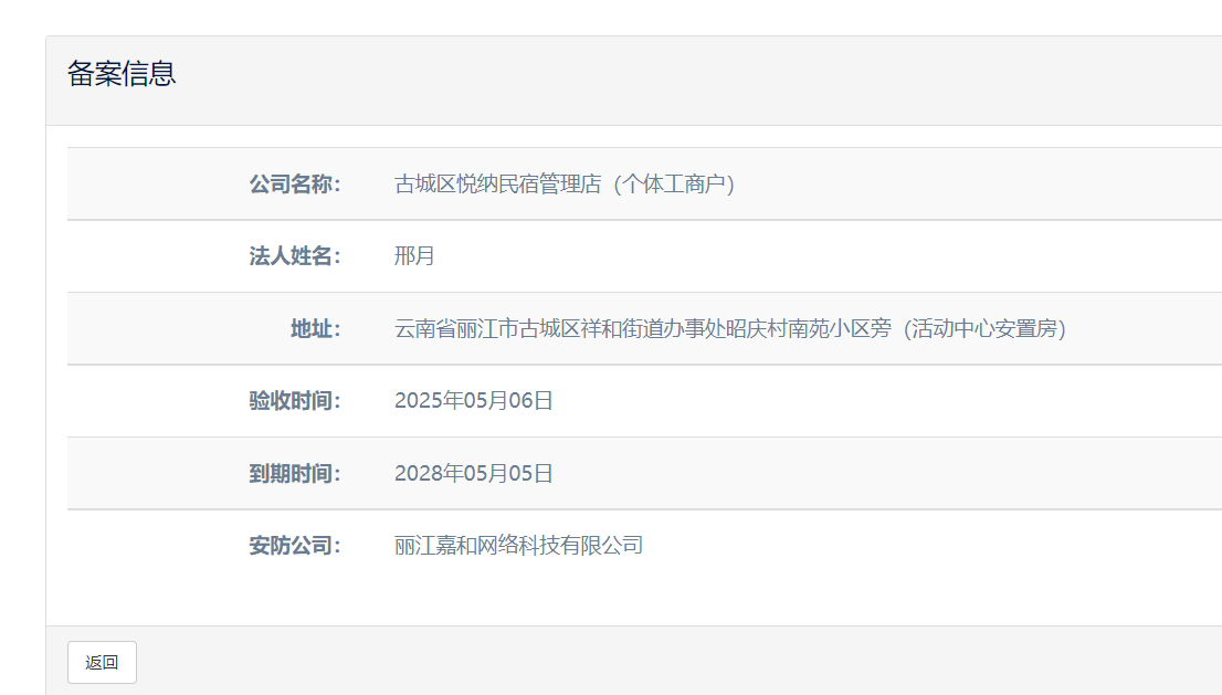 關于古城區(qū)悅納民宿管理店(個體工商戶)電子監(jiān)控安防合格證下證通知