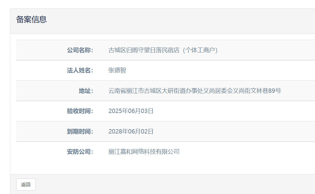 關于古城區歸閣守望日落民宿店(個體工商戶)電子監控安防合格證下證通知