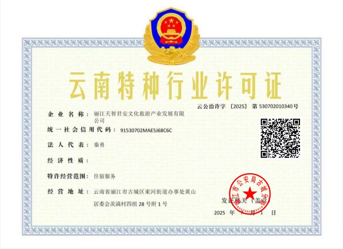 關于麗江天智君安文化旅游產業發展有限公司電子特種行業許可證下證通知