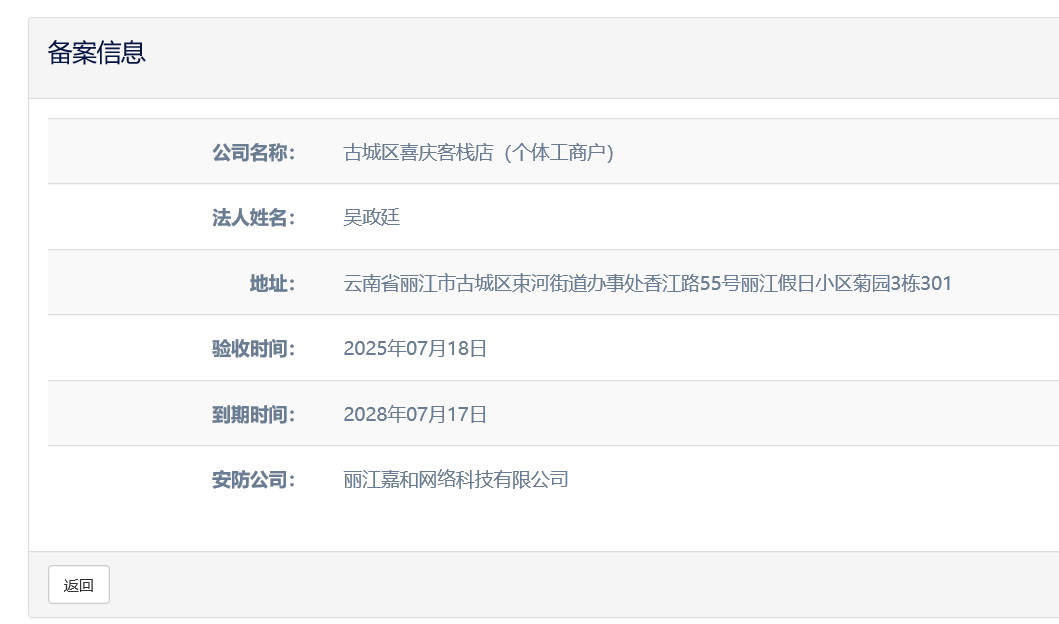 關于古城區(qū)喜慶客棧店(個體工商戶)電子監(jiān)控安防合格證下證通知
